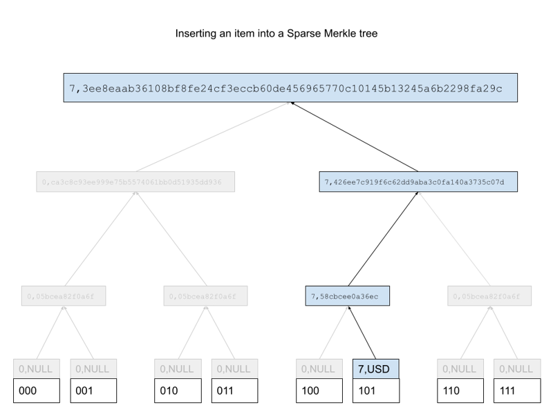 资金的发送者需要创建一棵新的稀疏默克尔总和树,反映新的余额。这是通过减少特定叶子的余额、增加另一个叶子的余额来实现的。稀疏默克尔总和树保证了在这样一笔交易中,不会创建新的资产(不会通胀),并且发送者对这项资产的索取权已被完全放弃。