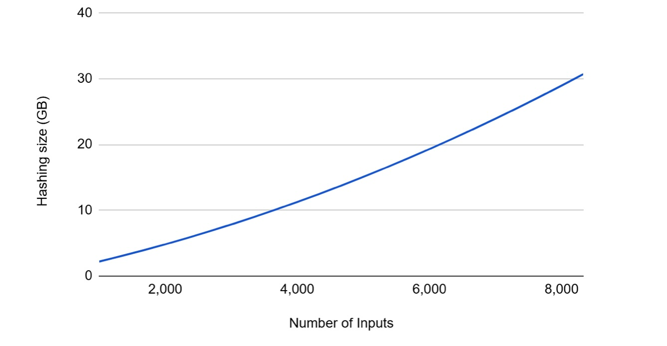使用上述公式,我们画出了下图,它反映了需要哈希的数据的数量如何取决于攻击交易中的输入的数量。可以从这条曲线的形状看出一个平方函数。上述公式是不精确的,并不能精确地统计需要哈希的数量,它的用意只是演示:非常粗糙地表明这个膨胀问题以及其中的数学关系。