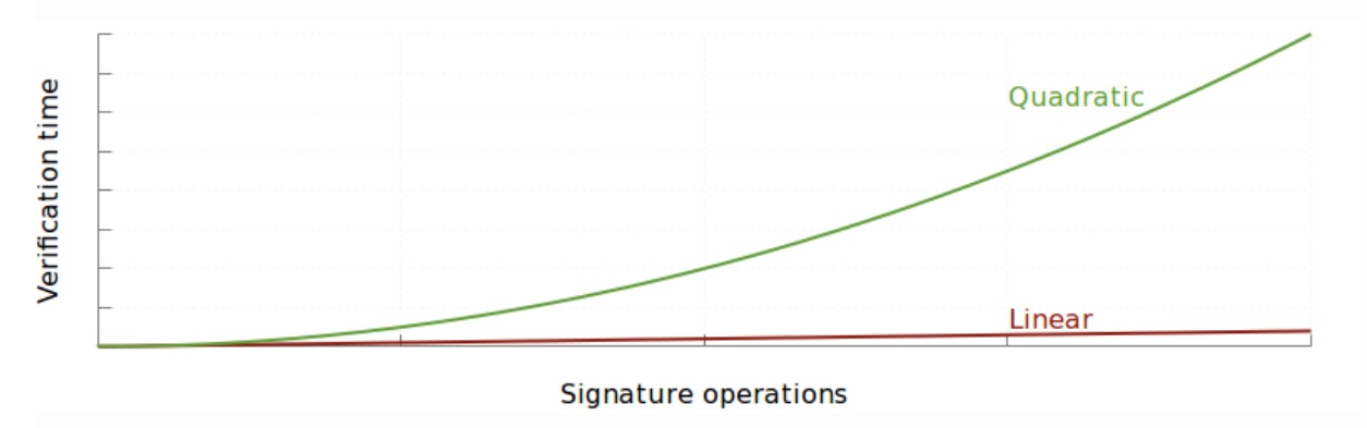 本质上,倍增一笔交易的体积,可以既让签名操作的数量倍增,又让为了验证每一个签名而需要哈希的数据的数量倍增。这已经可以在非实验环境中观察到:普通的单个区块只需 25 秒就能验证,而恶意制作的交易需要超过 3 分钟来验证。